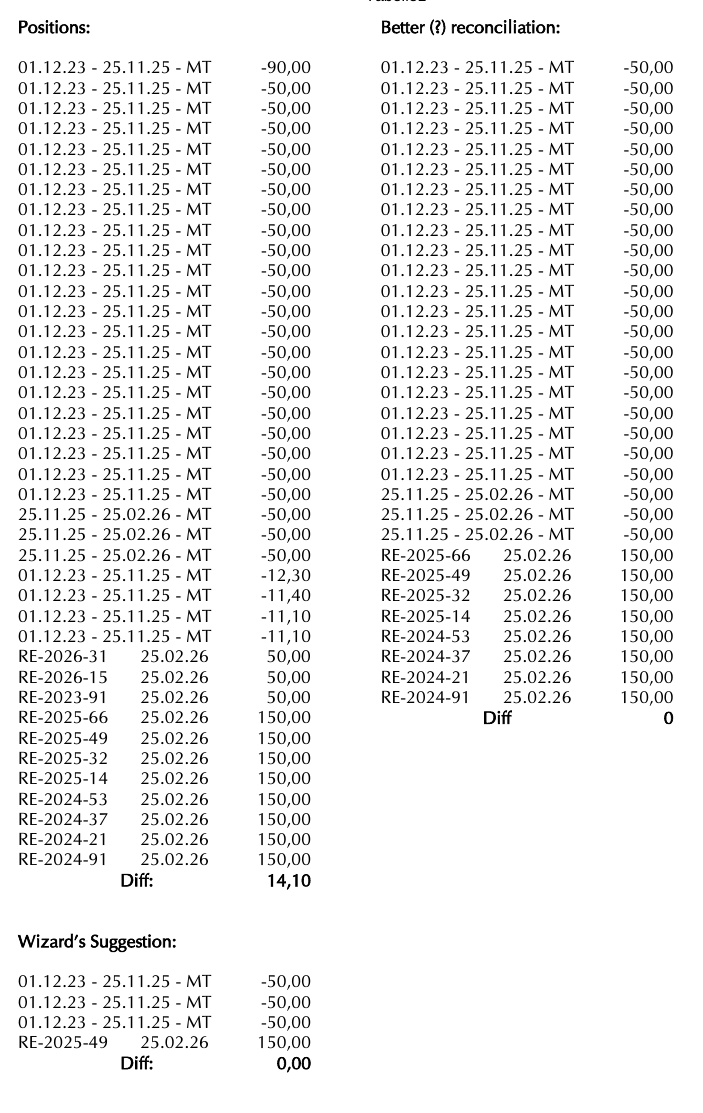 I’m trying to understand the account reconciliation wizard. My impression is that the wizard could do a “better” job, meaning: It could include more lines than it actually does. When clicking the blue ‘+’, I can see much more lines and can manually reconcile much more than the wizard suggests: