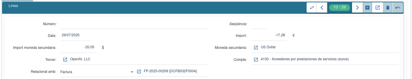 Una vez rellenados estos campos, podras buscar tu factura en “Relacionado con” ya que allí solo te apareceran las facturas en la divisa secundaria.